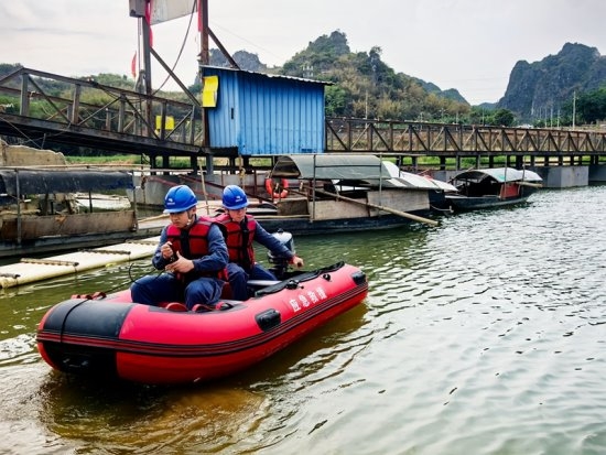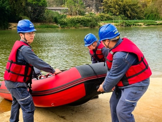 此次演练紧贴汛期供电保障实际,精准设置预警发布、重点用户用电保障、应急物资水上运送三大实战科目。演练启动后,各部门闻令而动、协同高效,安监部严格依照应急预案,20分钟内完成防风防汛黄色预警通知单编制、领导签发及全流程推送;市场部快速响应,精准向动车站、交通枢纽等重要敏感用户推送用电安全提醒,全面落实重点用户防范保障工作;针对内涝道路受阻场景,参演队伍规范完成水域选定、涉水防护、橡皮艇操控、应急电源运送等全流程操作,从设备检查、人员登船到航行停靠、收尾撤离,环节紧凑、操作规范,充分展现出过硬的专业素养与实战能力。